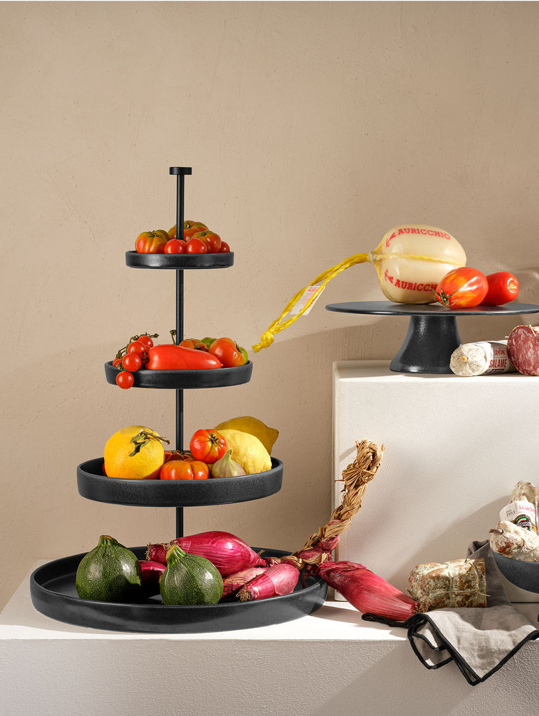 4-stufige Etagere mit schwarzmatten Tellern, die einen hohen Rand haben. Mit dieser dekorativen und edlen Etagere lassen sich viele Speisen stilvoll servieren: Ob Aufschnitt und Obst zum Frühstück, Kuchen & Gebäck am Nachmittag oder Antipasti & Co am Abend. Die Etagere hat einen Griff aus Edelstahl (Höhe: 61 cm) und vier verschieden große Teller (Durchmesser: 41 / 28 / 20 / 14,5 cm).
