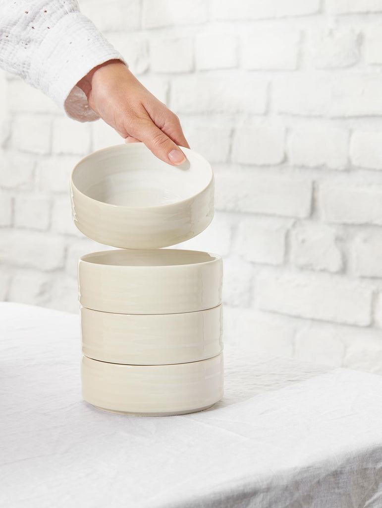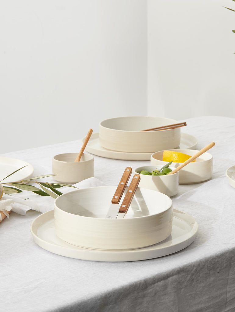 Pastaschale aus der Kollektion re:glaze. Wir haben Tonabfälle und überschüssige Glasuren vor der Entsorgung gerettet, aufbereitet und für die Herstellung dieses Geschirrs wiederverwendet. Das Ergebnis ist ein Steinzeug aus recyceltem Ton, kombiniert mit einer unverwechselbar weißen und zu 100% recycelten Glasur – wir nennen sie „Sparkling White“.