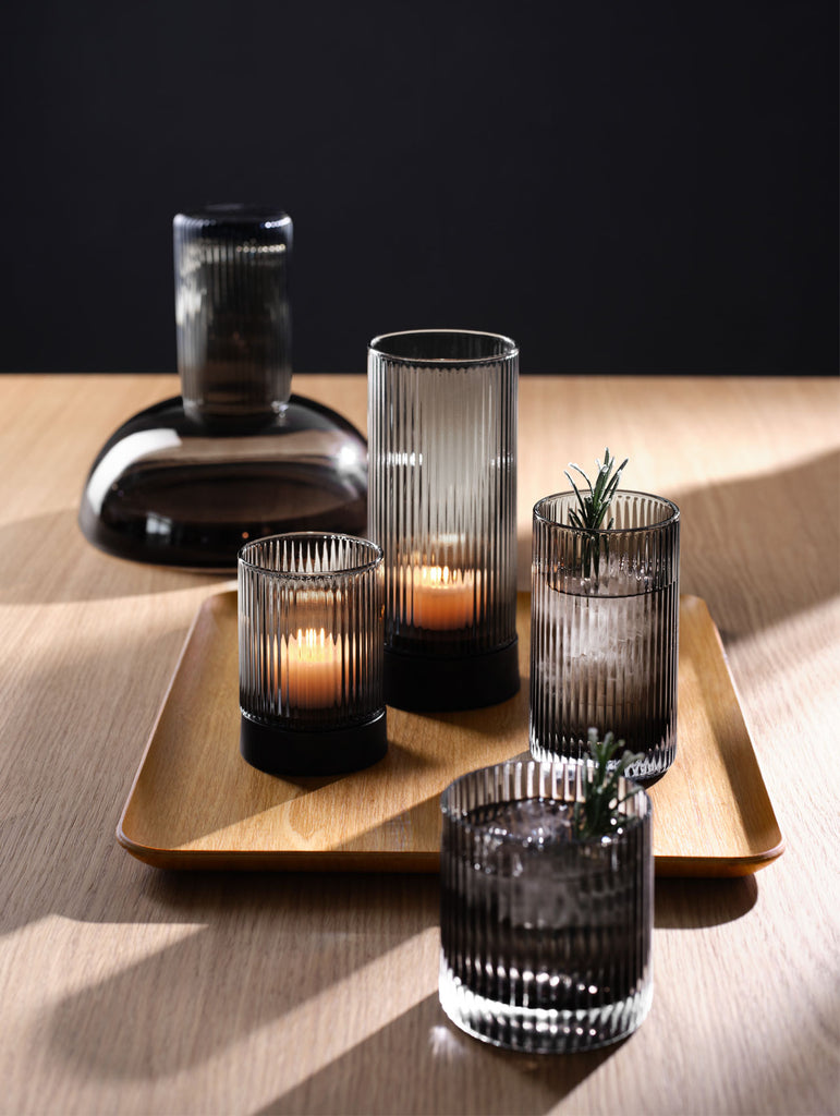Windlicht aus leichtem Borosilikatglas mit Porzellanfuß. Das gerillte Oberflächendesign sorgt für funkelnde Lichtspiele. Ebenso überzeugen die funktionalen Details. So sorgt der edle Porzellanfuß dafür, dass selbst die Hitze einer ausbrennenden Kerze keinen Schaden auf dem Tisch anrichten kann.
