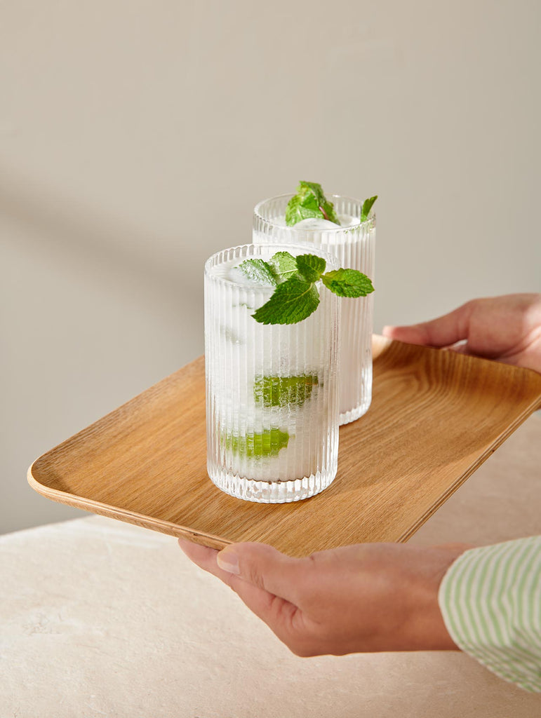 Longdrinkglas mit gerilltem Oberflächendesign aus der Kollektion Juna. Das mundgeblasene Trinkglas ist langlebig und spülmaschinengeeignet. Das Glas kann auch als Verschluss für die dazu passende Karaffe verwendet werden.