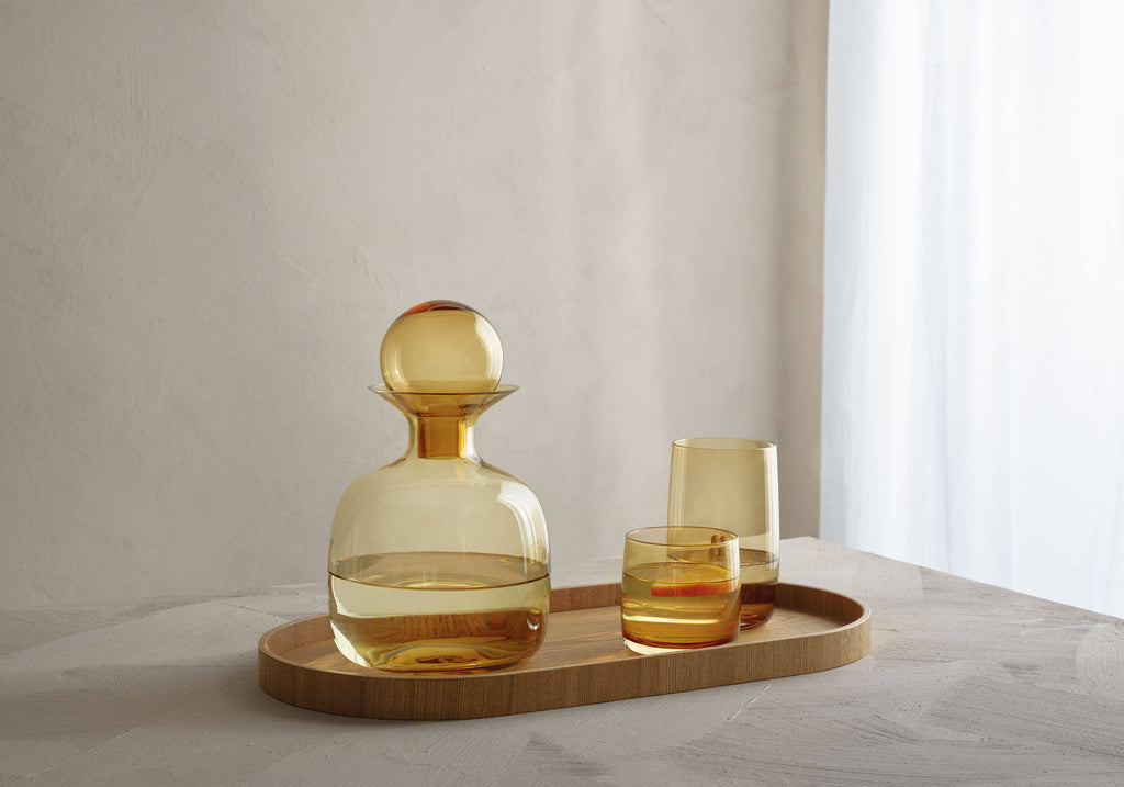 Ob trendige Longdrinks mit Gin oder alkoholfreie Erfrischungen wie Schorlen und Limonaden: das Glas mit 0,4 Liter Fassungsvermögen liegt, wie der kleinere Tumbler, durch einen verstärkten Boden und die leicht bauchige Form wunderbar in der Hand. Wie diese Gläser sind auch die Karaffen, die es in zwei genussgerechten Größen gibt, ein sensorisches und gestalterisches Highlight in der Hausbar. Mit nur einem Hauch von Farbe strahlen die Gläser im Dekor "amber" wohlige Wärme aus.