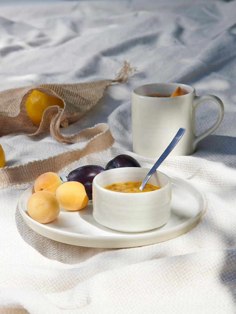 Kleine Schale aus der Kollektion re:glaze. Wir haben Tonabfälle und überschüssige Glasuren vor der Entsorgung gerettet, aufbereitet und für die Herstellung dieses Geschirrs wiederverwendet. Das Ergebnis ist ein Steinzeug aus recyceltem Ton, kombiniert mit einer unverwechselbar weißen und zu 100% recycelten Glasur – wir nennen sie „Sparkling White“.