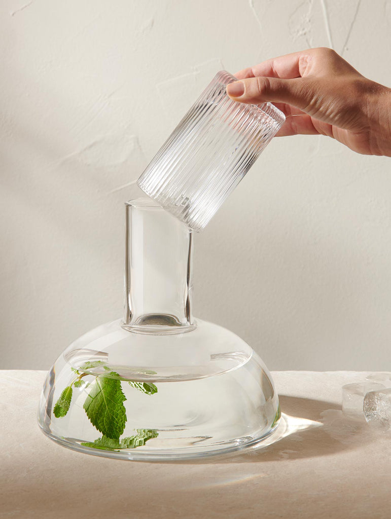 Moderne Glaskaraffe aus mundgeblasenem, klarem Glas. Der Clou der Karaffe ist der Verschluss: das umgekehrt aufgesetzte Trinkglas sitzt sicher auf dem schlanken, langen Hals der Karaffe und schützt so den Inhalt und dessen Aromen.