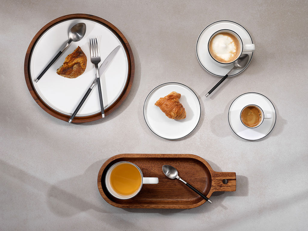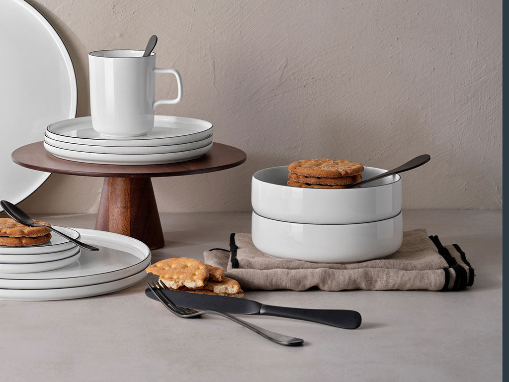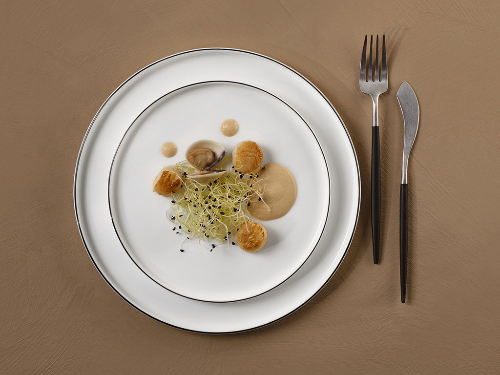 Handgemalte, mit dem Pinsel aufgetragene, schwarze Linie. Für jeden Anlass konzipiert: extreme Härte, warmes Weiß, puristisches Design und pure Eleganz. Auch in der Gastronomie einsetzbar.