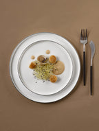 Hochwertiger, mittelgroßer, weißer Dessertteller der Serie OCO ligne noire. Mit einem Durchmesser von 21 cm ist dieser Teller auch perfekt als Frühstücks- oder Kuchenteller einsetzbar. Die schwarze, handgemalte Linie am Rand verleiht dem schlichten, weißen Design dieses Tellers das gewisse Etwas. Alle Teller dieser Serie zeichnen sich durch eine extreme Stoßfestigkeit aus und sind damit perfekt für den Einsatz im Alltag geeignet. Der Dessertteller ist perfekt kombinierbar zu allen anderen Artikeln der OCO Serie.